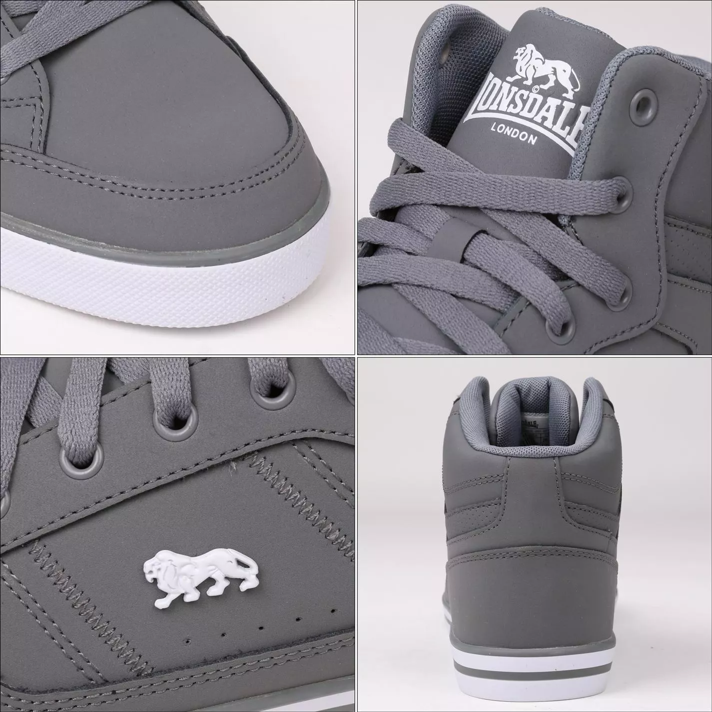 Grab some simple style and fashion in these Lonsdale Canons Mens Trainers! The high top design makes sure that the Lonsdale Canons Mens Trainers stand out from he crowd with eye catching looks and a unique silhouette. Completer with a chunky sole unit for improved comfort and cushioning as the padded collar and tongue deliver a superb firm hold with help from the lace up fastening. You do not want to miss out on these ones.