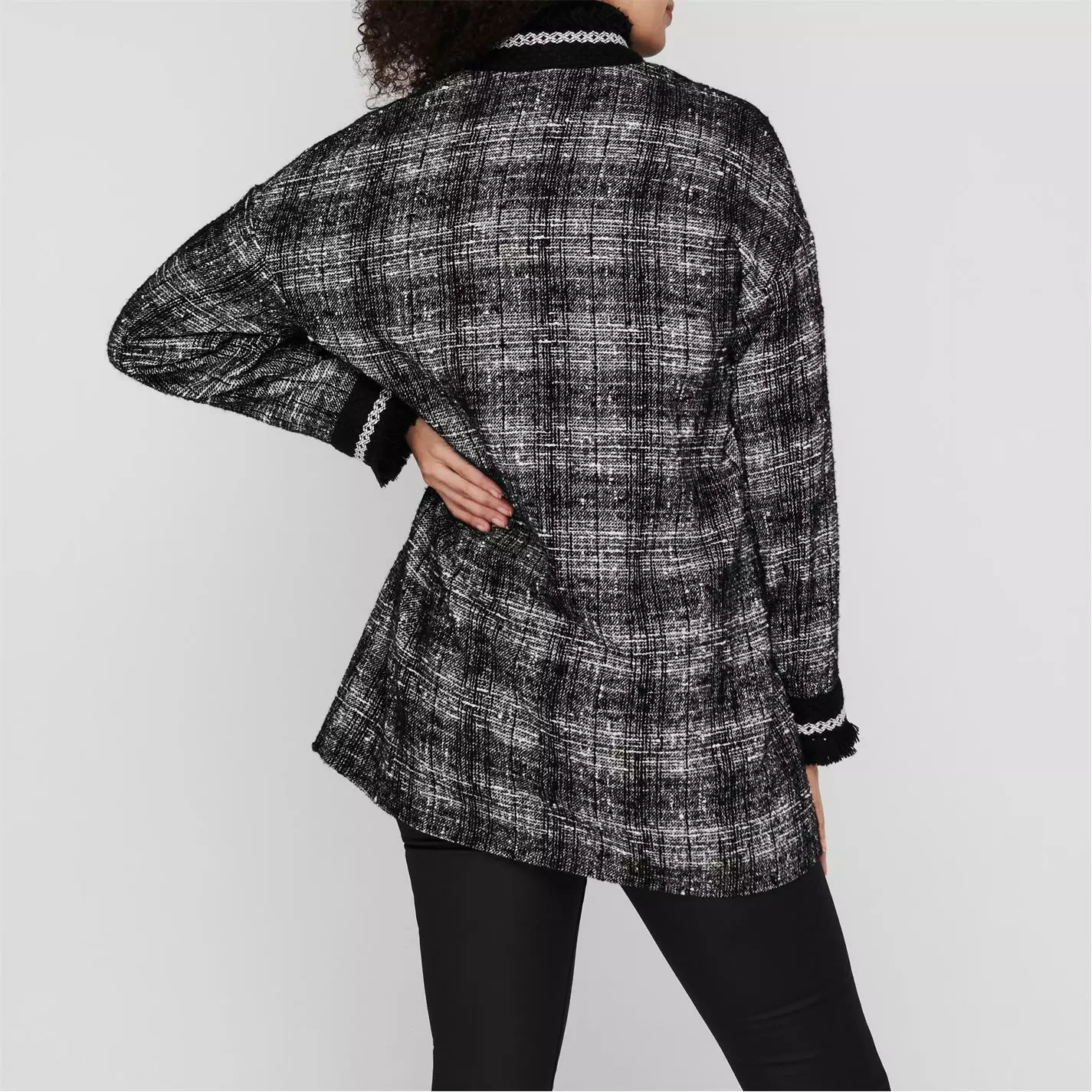 This Tweed inspired Jacket from Marella will welcome a vintage yet modern approach to your smart attire. Crafted from a mix of Acetate and Polyester for a high end finish, the jacket has been designed with a blazer inspired silhouette, styling an open finish, long sleeves and front slip pockets. Decorated with knitted detailing, this classic jacket features ruffled trims, a woven construction and mature, modest finish.