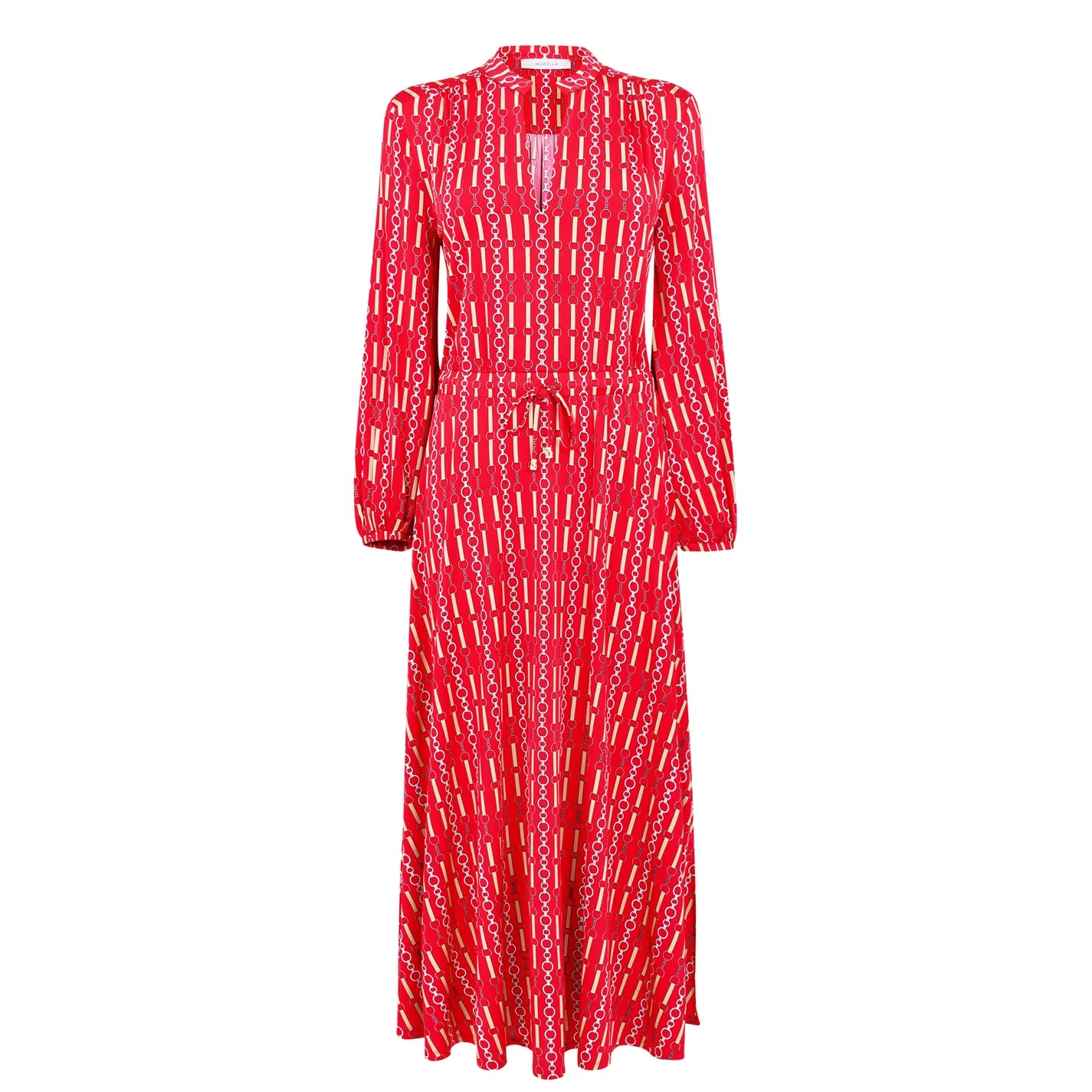 Make a statement in this bold printed dress brought to you by Marella. Decorated with a repeat pattern throughout, the dress styles a midi length cut, featuring a v neckline, long sleeves and silk finish for a high quality completion. Styling a tie waist for a more flattering touch, the dress can be worn from day to day, easily dressed up or down.